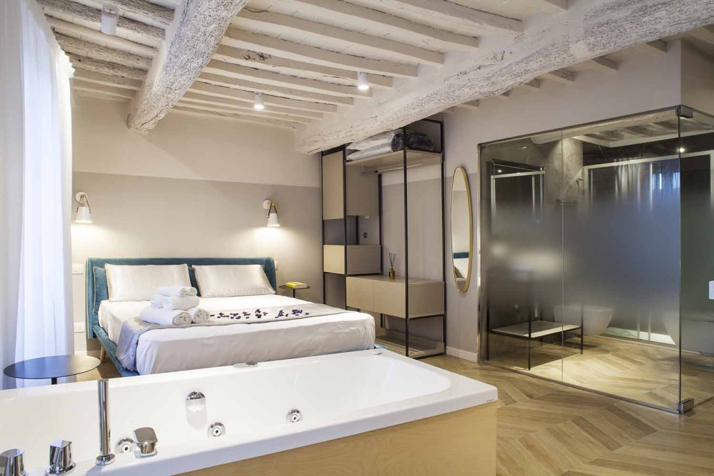 monolocale con camera da letto matrimoniale dotata di vasca idromassaggio in camera, angolo cottura, un particolare e bellissimo bagno a vista dotato di grandissima doccia. Aria condizionata caldo/freddo.